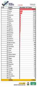 Considering the number of COVID-19 cases recorded in Nigeria, Kano State has the second highest after Lagos with 980 confirmed cases; FCT -792; Katsina -385; Edo -351; Borno -322; Kaduna -320; Oyo -318; Ogun -316; Rivers -290; Jigawa -274; Bauchi -256; Gombe -170; Kwara -127; Delta -116; Sokoto -115; and Plateau -113.